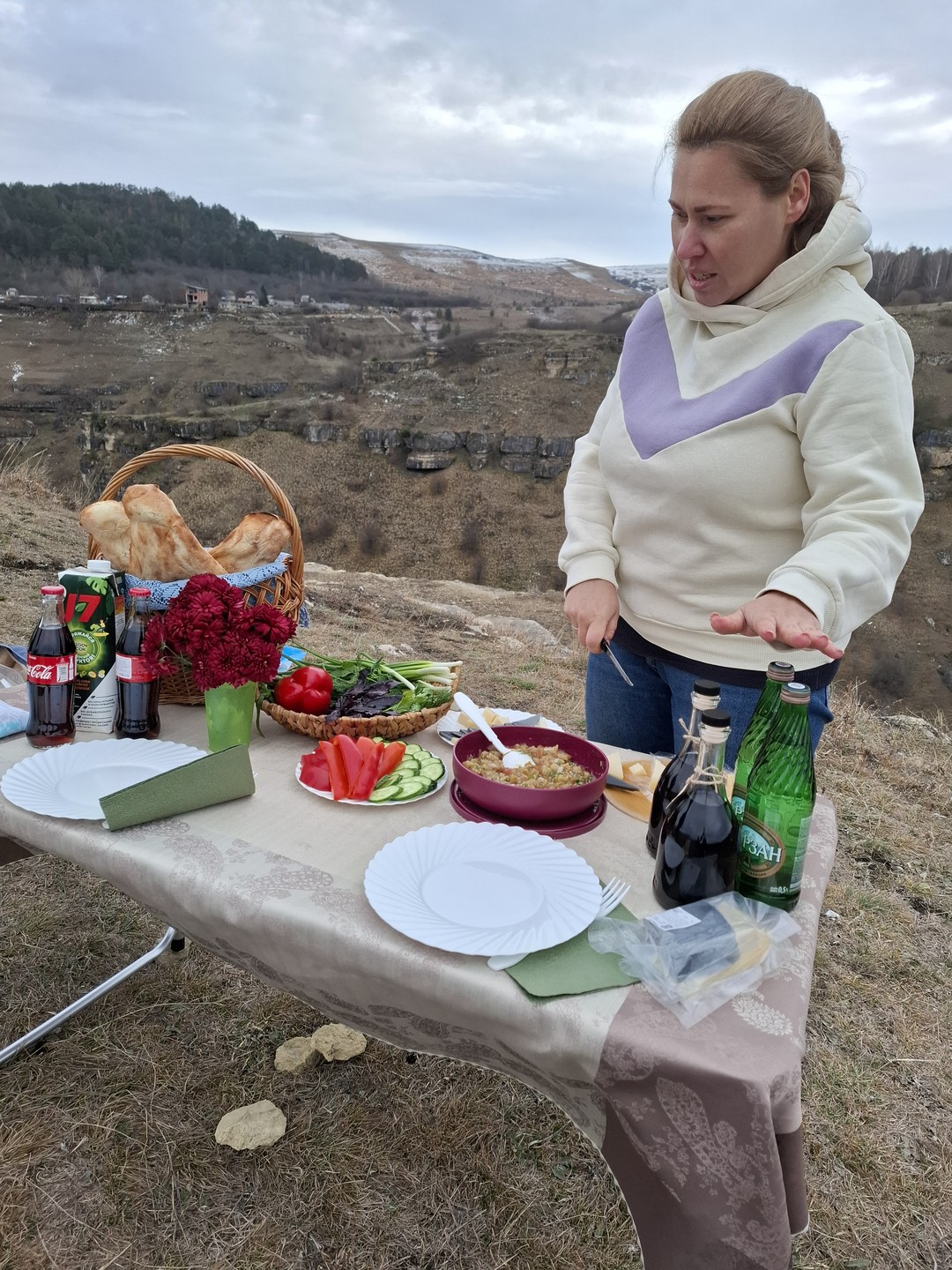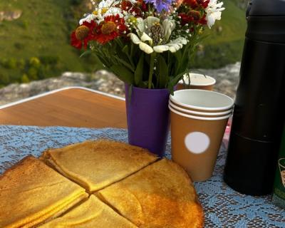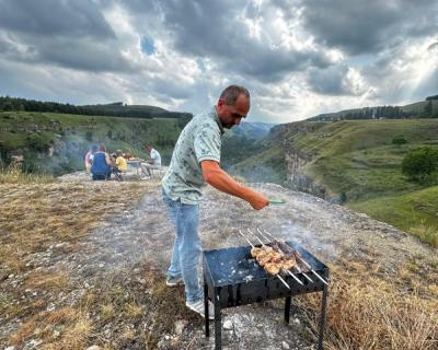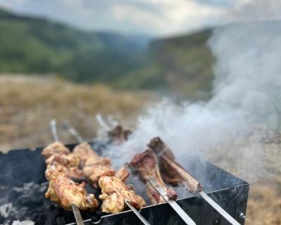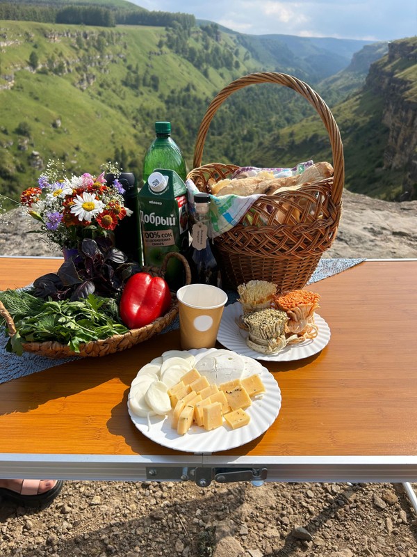 - В пикник входят: шашлык из мяса или рыбы, сыр, зелень, овощи, домашняя выпечка, прохладительные напитки (нарзан, сок, компот на выбор), чай из горных трав и свежесваренный кофе
