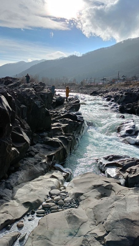 12:00 — проезжаем через красивый город Карачаевск до Каменного моста, где река Кубань сужается и образует мощный ревущий поток. Тут же пообедаем в аутентичном кафе над рекой